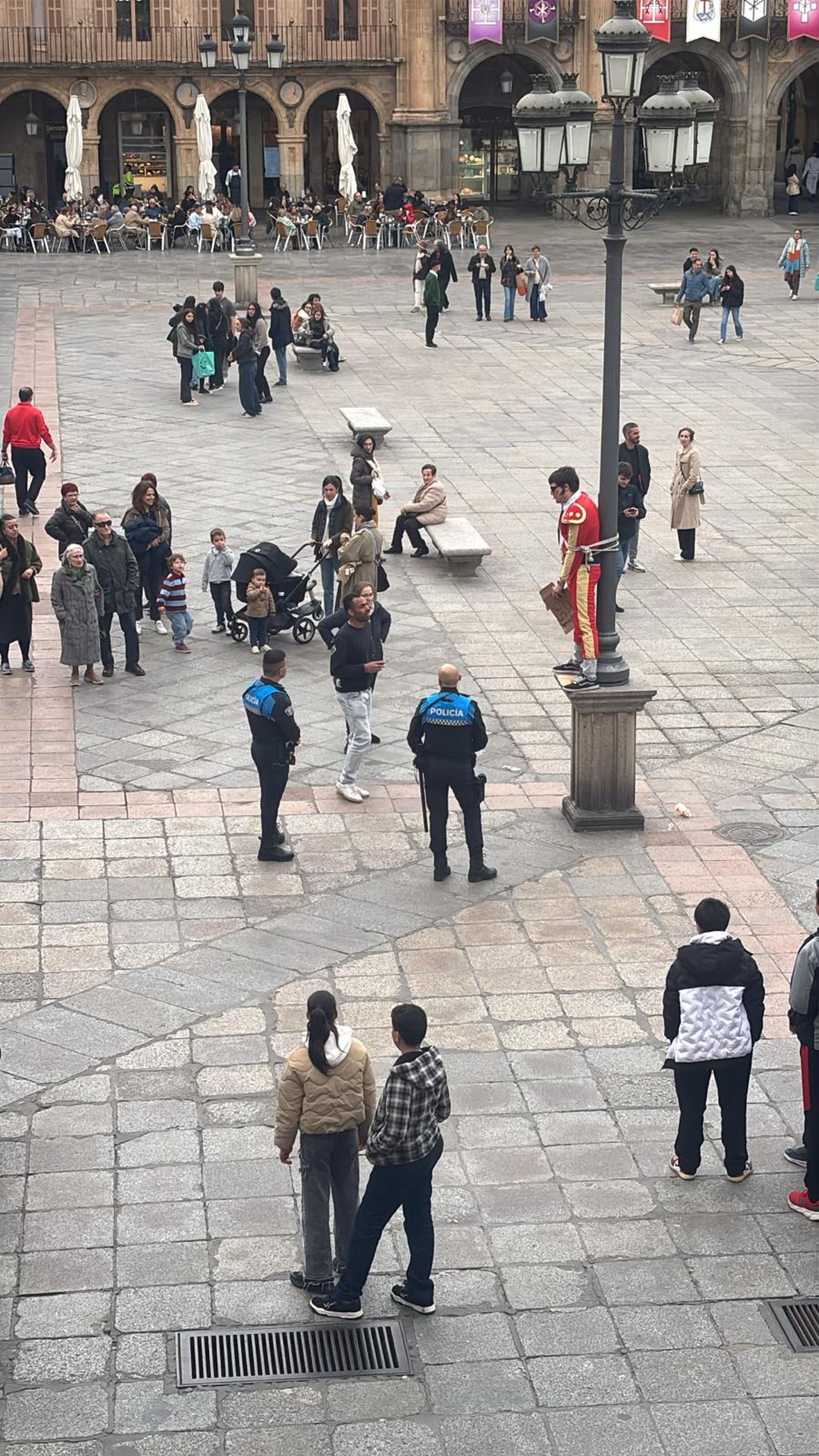 Este sábado por la tarde, vecinos y turistas de la Plaza Mayor han sido testigos de una escena insólita, un hombre disfrazado fue atado a lo alto de una farola durante una despedida de soltero, lo que obligó a la Policía Local a intervenir.