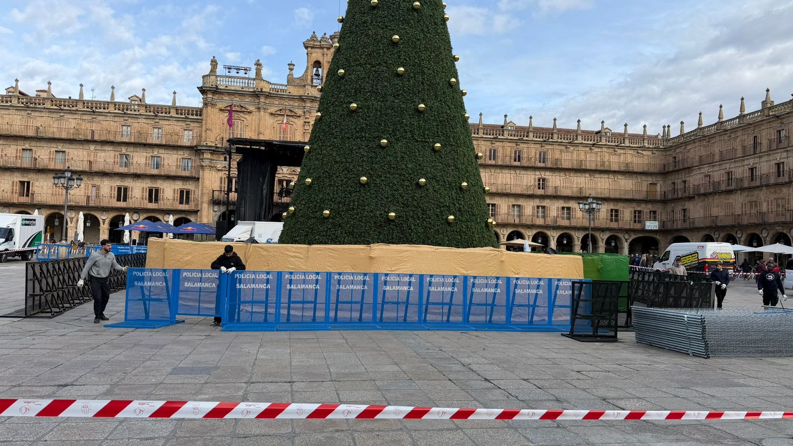Entre las primeras actuaciones destaca la instalación del doble vallado de seguridad que protege al enorme árbol situado en el centro de la plaza, una medida destinada a garantizar la seguridad de los asistentes. Paralelamente, los operarios avanzan en el montaje del escenario principal, donde tendrán lugar las actuaciones y animación previstas para la jornada festiva.